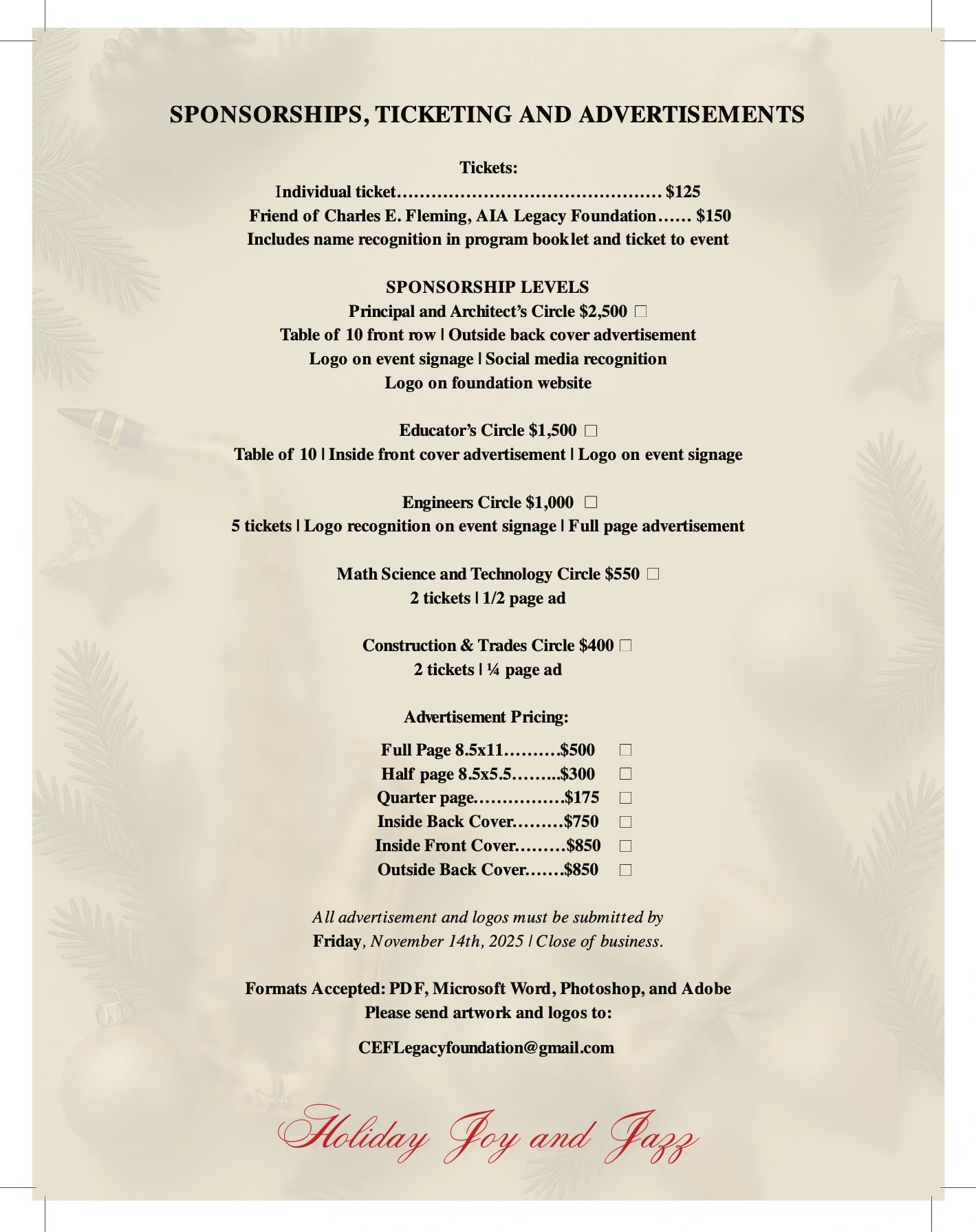 The Charles E. Fleming Legacy Foundation (CEFL) disseminates historical and contemporary information on the contributions of Charles E. Fleming to the fields of Architecture and Design, Engineering, Construction Management, and other Construction-related careers. CEFL educates the community on how Architecture and Design benefit humanity and contribute to the development of communities.